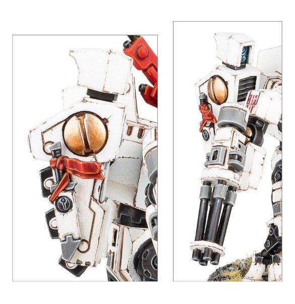 Модель обирается из множества угловых компонентов брони и других деталей. Торс, руки и лодыжки доспеха прикрыты армированными пластинами, в то время как аккуратные сочленения и пазы, болты и механизмы прекрасно видны и придают общей скульптуре отличную детализацию и «легкость». Собрать боевой доспех можно в разных вариантах и положениях. В комплекте идет ряд опционального вооружения – залповые пушки, плазменные винтовки, огнемет, бластер и ракетная установка. Отряд дополнен шестью оружейными Дронами.