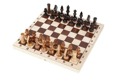 В комплект входят игральная доска и два комплекта шахматных фигур, по 16 штук в каждом. Высота фигур не превышает 7.3см, основание выполнено из искусственной кожи. Очень полезно обучать игре в шахматы детей – ведь это отличная тренировка логики, внимания, тактики.