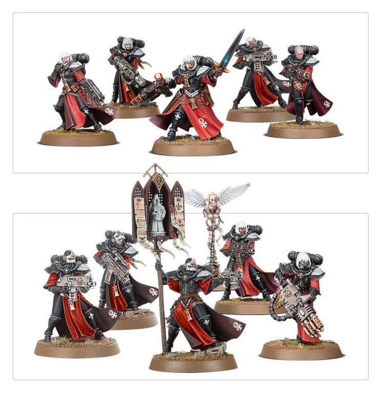 Вместо десяти Боевых Сестёр данный набор позволяет собрать отряд из пяти Доминион и отряд из пяти Целестинок. Доминионы вооружаются болтганами, но при этом до четырёх бойцов можно вооружить специальным вооружением: штурмовым болтером, мелта-ружьём или огнемётом. В комплект входит по четыре оружия из перечисленных, чтобы обеспечить вам максимальную свободу выбора. Целестинки вооружены болтганами, при этом две из них могут нести специальное оружие из списка выше, а одна из воительниц может заменить специальное оружие на тяжёлый болтер или тяжёлый огнемёт. Одна из Целестинок может нести в битву священный Симулякрум Империалис, который может быть двух видов. Отдельные детали также позволят вам собрать Старшую Доминион (Dominion Superior) и Старшую Целестинку (Celestian Superior).