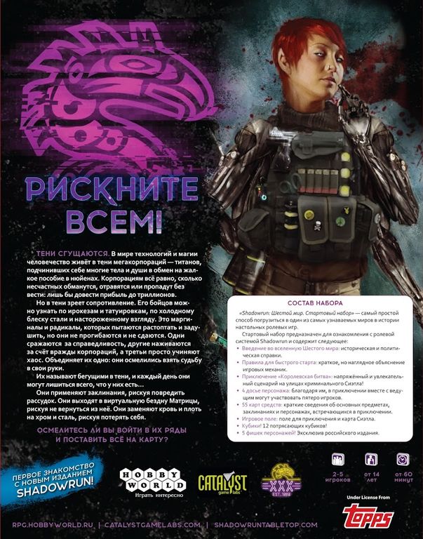 "Shadowrun: Шестой мир. Стартовый набор" – это великолепная и доступная возможность быстро и легко попробовать легендарную ролевую систему, в которой сплелись в один клубок киберпанк и высокое фэнтази.