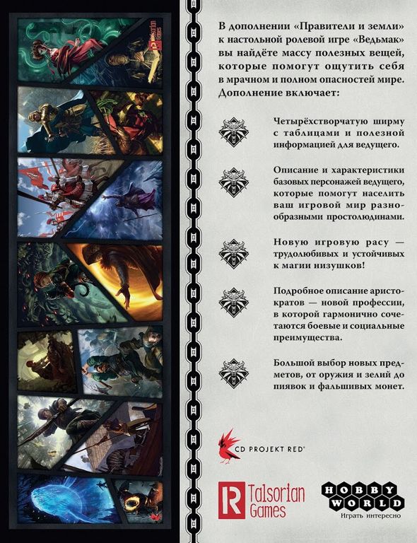 Мир "Ведьмака" предстанет в новом свете, вместе с дополнением "Правители и земли". В него входят компоненты, которые обновят процесс игры и помогут прочувствовать как можно глубже ситуацию вхождения в мир, полный мрака, ужаса и опасностей. Для ведущего предусмотрена новая ширма, которая содержит множество полезной информации. Появились описания и черты персонажей, которые дополнят ваш мир простолюдинами, а также трудолюбивыми и крепкими существами из новой расы. Более детально представляется описание аристократов и добавляется обширный набор предметов от зелий до фальшивых денег.