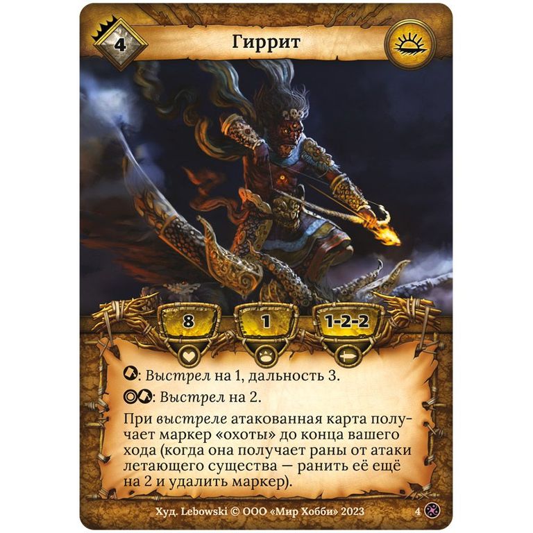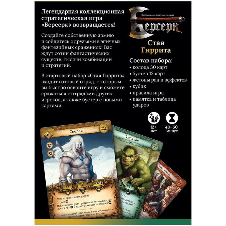 Стартовый набор содержит всё необходимое, чтобы быстро войти в игру, будь вы фанатом классики или новичком в мире "Берсерка"! Внутри вы найдёте готовую колоду "Стая Гиррита" из 30 карт и бустер с 12 картами: более чем достаточно, чтобы вступить в бой полностью подготовленным!